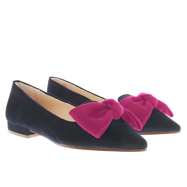 Neben richtig hohen Pumps sind auch flachere Schuhe, die sehr gut zu einem Kleid kombiniert werden können, erhältlich. Diese spitzen Ballerinas „COCO“ mit einer auffällig großen Schleife sind besonders feminine Alltagsschuhe.