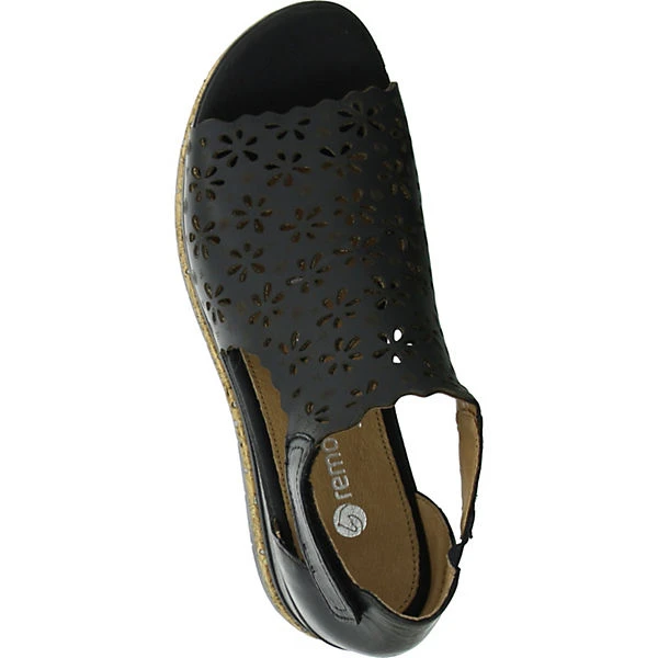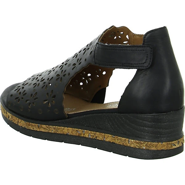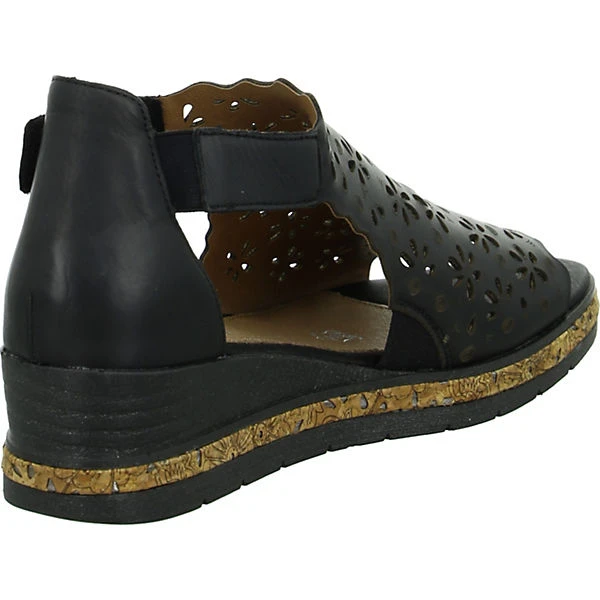 Mit dekorativem Lochstanz-Blumenmuster und hochgezogener Front sind die schwarzen Keisandalen von Remonte ein schöner Anblick. Die Damen-Sandaletten sind mit einem elastischen Einsatz im seitlichen Schaftbereich und praktischem Klettverschlussriemen versehen. Eine gepolsterte Leder-Decksohle sorgt für Komfort und ein korkähnliches, geblümtes Sohlenband verleiht den Sommerschuhen zusätzlichen, natürlichen Charme.
