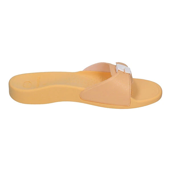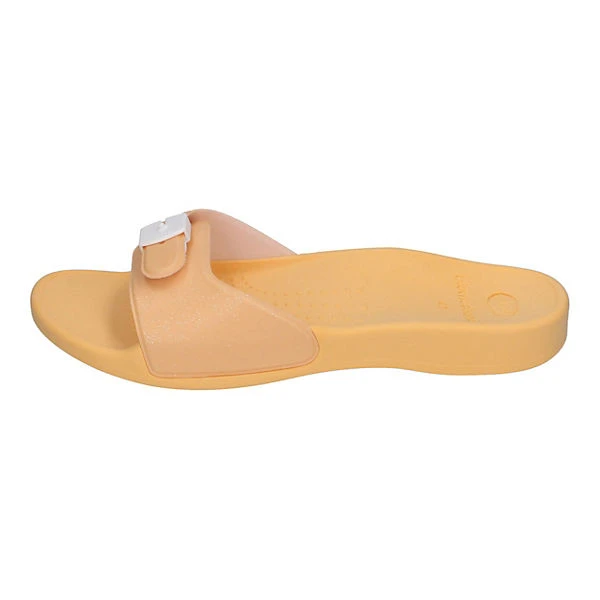 Scholl ist bekannt für den erstklassigen Tragekomfort seiner Schuhe. Die schönen Pantoletten Scholl Sun in sommerlichen, dezent glitzernden Pastell-Farben, hier in Orange, überzeugen durch Look & Feel. Die Innensohle mit Biomechanics® Technologie und die anatomische Form der Innensohle mit dem Bewegungssteuerungssystem Tri-planare ermöglicht eine bessere Haltung und Stellung des Fußes und bietet einen optimalen Tragekomfort. Aber die Pantolette sieht nicht nur gut aus: Die Scholl Technologie Biomechanics® bekämpft das häufig auftretende Problem des Knickfußes, indem sie hilft, die Haltung zu verbessern und die üblichen Gelenkschmerzen zu lindern. Die Oberfläche des Fußbettes wurde so gestaltet, dass die mögliche Rutschgefahr auch bei nassen Füßen reduziert wird.